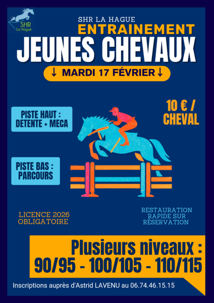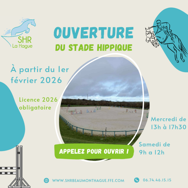 📞 Comme d'habitude, pour les cavaliers amateurs, les pistes sont ouvertes chaque mercredi de 13h à 17h30 et chaque samedi de 9h à 12h sur appel auprès d’Astrid Lavenu (06 74 46 15 15). Pas d'appel = pistes fermées. Tarif inchangé de 5€ par cheval. Licence 2026 obligatoire. Merci d’envoyer une copie de votre licence 2026 à Astrid avant votre première venue de l’année.